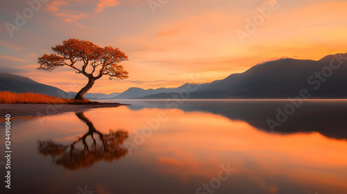 © Giman, Fototapeta premium Solitary tree sunset lake reflection mountains