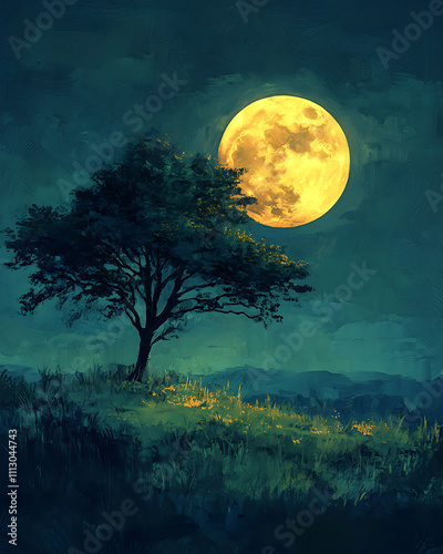 © Aksapix Studio, Naklejka premium Solitary Tree Underneath a Giant Yellow Moon at Night: A Serene Night Landscape Painting