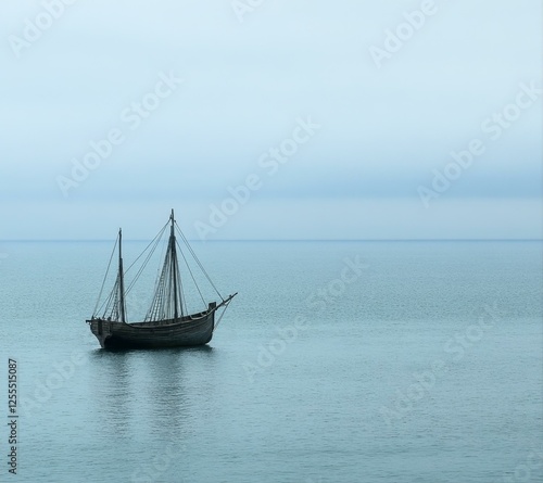 © Thymezz, Fototapeta premium Solitary Vessel Drifting on Calm Waters Under a Pale Sky An Image of Tranquility and Reflection