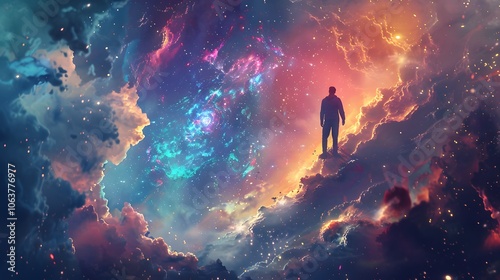 © Wuttichai, Obraz premium Solitary Wanderer Amid Cosmic Explosion in Ethereal Universe