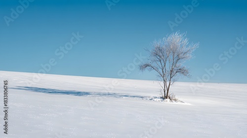Fototapeta premium Solitary winter tree evokes serene calm across a vast snowfield under clear...