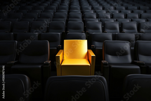 Fototapeta premium Solitary yellow chair amidst black theater seats cinema hall photography indoor perspective isolation