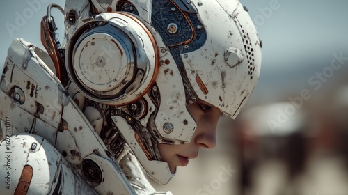© Jakael, Fototapeta premium Solitude and introspection of a futuristic warrior in the desolate landscape