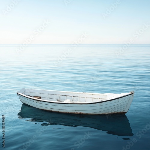 Naklejka premium Solitude on the Calm Sea: A lone white rowboat floats serenely on a tranquil...