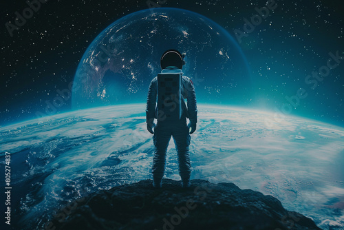 © Tohamina, Fototapeta premium Solo astronaut gazing at Earth, illustrating the isolation and responsibility in leadership