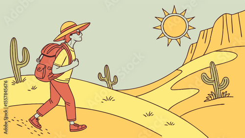 © esmiloenak, Obraz premium Solo Traveler Hiking Through a Sunny Desert Landscape with Cacti and Winding Path, Adventure Illustration