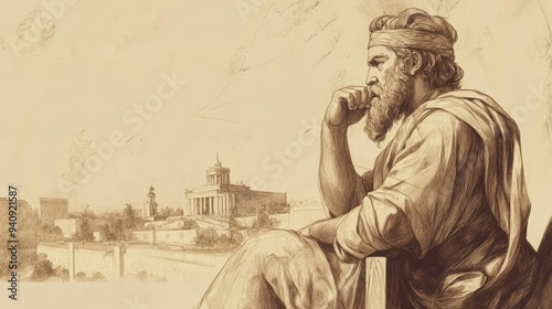 Fototapeta premium Solomon Reflecting on His Achievements in His Later Years in 2 Chronicles, With Temple and Palace in the Distance, Biblical Illustration for Spiritual Reflection, Beige Background