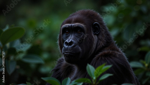 Obraz premium Somber eastern lowland gorilla in tropical woods at dusk, endangered...