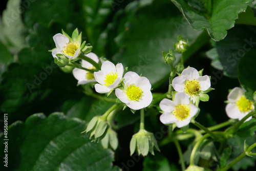 Obraz premium Some beautiful white flowers strawberries plant lit by the warm sun