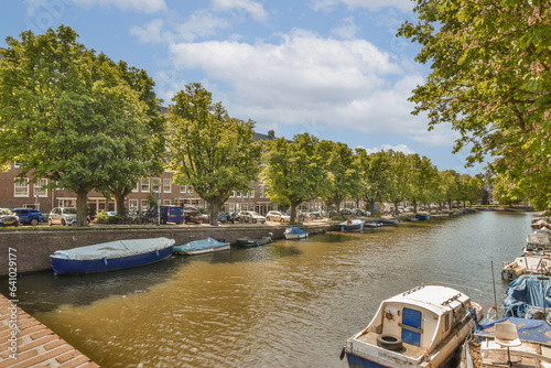 © Casa imágenes, Naklejka premium some boats docked in the water near trees and buildings on either side of the river with blue skies above them