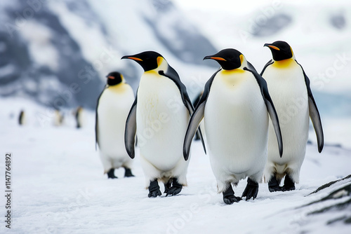Fototapeta premium Some penguins in the Arctic walking around on the North Pole and looking for something. Generative AI