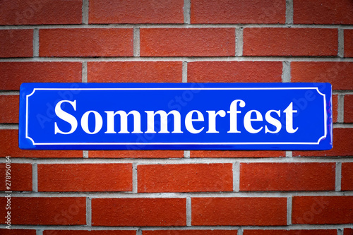 © Daniel Ernst, Obraz premium Sommerfest Schild blau an Backsteinwand