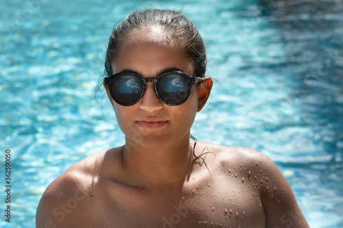Fototapeta premium Sommerportrait junge Frau mit Sonnenbrille am Pool