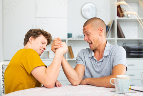 © JackF, Fototapeta premium Son arm restling his father and winning. They smiling and enjoying process.