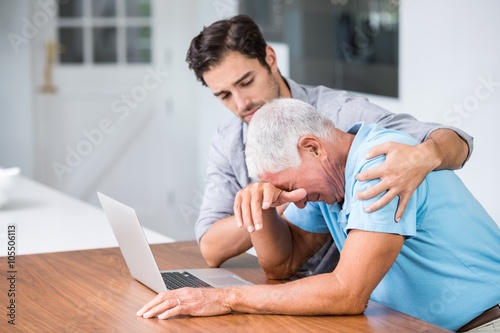 Obraz premium Son comforting tensed father sitting at desk