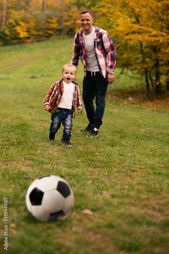 Fototapeta premium Son playing with ball on grass