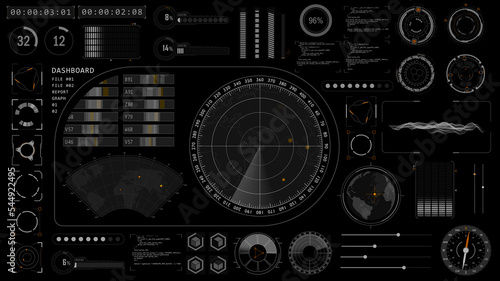 Fototapeta premium Sonar radar screen searching an object with futuristic head up display ( HUD UI ) technology interface screen and chat panel abstract background