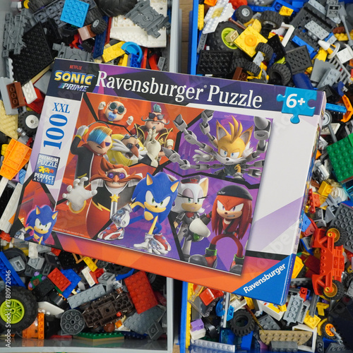 © Everyday Frame, Fototapeta premium Sonic Prime puzzle box with characters and colorful Lego bricks background