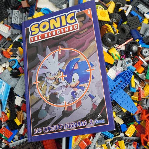 © Everyday Frame, Fototapeta premium Sonic the Hedgehog comic book with Silver and Sonic characters, surrounded by colorful toy bricks