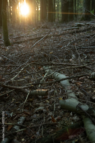 Fototapeta premium Sonne scheint durch Bäume in einem Wald im Herbst