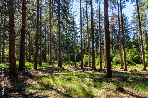 © H. Rambold, Fototapeta premium Sonnen im lichten Fichtenwald mit blauem Himmel