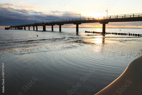 © holger.l.berlin, Fototapeta premium Sonnenaufgang am Ostseestrand; An der Bansiner Seebrücke
