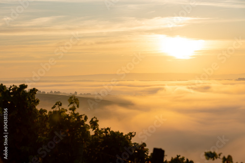 Fototapeta premium Sonnenaufgang über den Weinbergen am nebelverhangenen Main