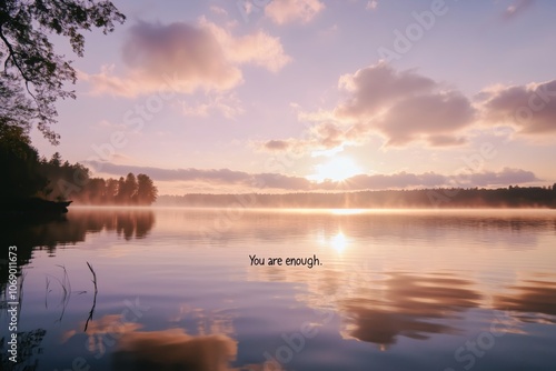 Fototapeta premium Sonnenaufgang über einem ruhigen See mit inspirierendem Zitat