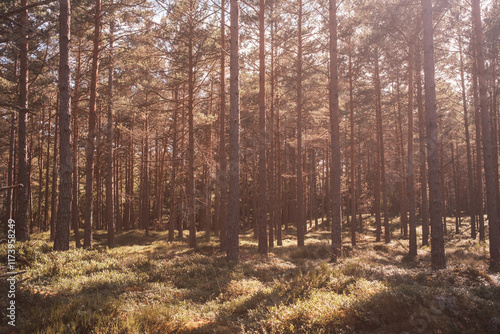 © ohenze, Obraz premium Sonnenlicht scheint durch Kieferwälder in Schweden