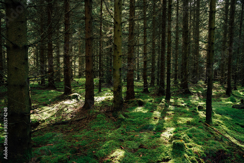 Fototapeta premium Sonnenschein im dichten Fichtenwald