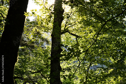 Obraz premium Sonnenstrahlen im Laubwald: Ein Blick durch grüne Blätter im Sonnenschein