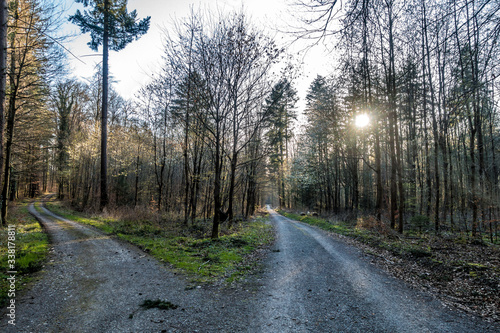 Fototapeta premium Sonnenstrahlen scheinen auf Waldweg