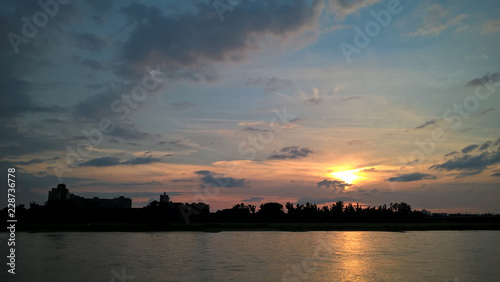 © sunakri, Naklejka premium Sonnenuntergang am Flussufer mit Sonnenstrahlen im Himmel