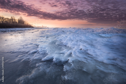Obraz premium Sonnenuntergang am gefrorenen Seeufer