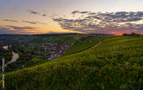 © dina, Naklejka premium Sonnenuntergang über den Weinbergen an der Vogelsburg und der Volkacher Mainschleife mit den Weinorten Escherndorf und Nordheim am Main, Landkreis Kitzingen, Unterfanken, Bayern, Deutschland