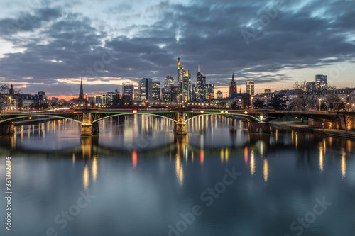Fototapeta premium Sonnenuntergang über Frankfurt Skyline, Spiegelung im Wasser