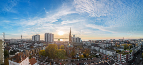 Obraz premium Sonnenuntergang in Down Town Bremerhaven, Panorama Aufnahme aus der Luft,...