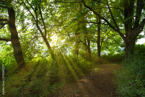 Naklejka premium Sonnnenstarhlen in sommerlich grünem Wald