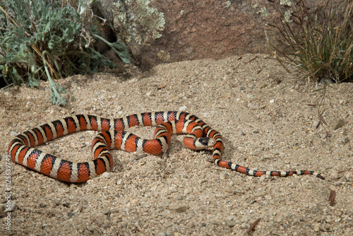 Naklejka premium Sonoran Mountain Kingsnake, Lampropeltis pyromelana pyromelana, non venomous, defensive musk and mimicry of the Coral snake, Arizona,