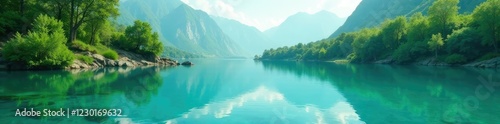 Fototapeta premium Soothing blue-green waters reflect a tranquil landscape, peaceful, blue green