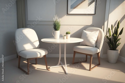 © samsulalam, Fototapeta premium Soothing minimalist decor featuring white armchairs, a circular table, and ornamental plants illuminated by sunlight through a window