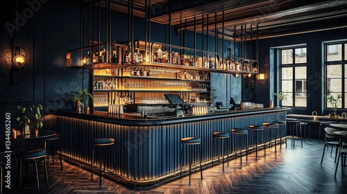 © Funster, Obraz premium Sophisticated Bar Interior Featuring Blue and Dark Wood Accents