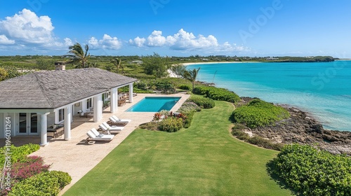 © Pannee, Obraz premium Sophisticated beachfront villa with minimalist architecture and blue skies.