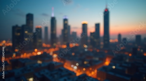 © Bias, Fototapeta premium Sophisticated business background: Blurred, bustling city skyline at dusk with warm office lights.