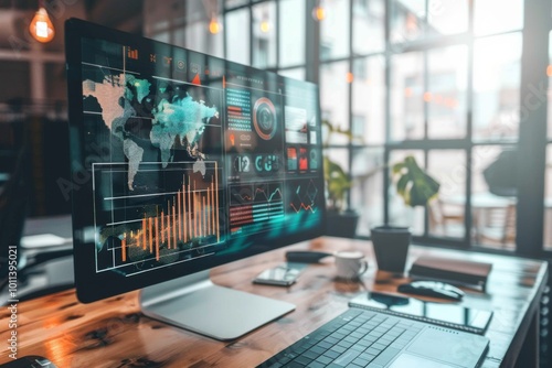 Fototapeta premium Sophisticated office environment with transparent screen showing swot analysis