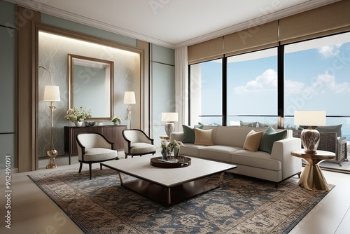 Fototapeta premium Sophisticated Penthouse Interior Mockup with Elegant Furniture and Serene...