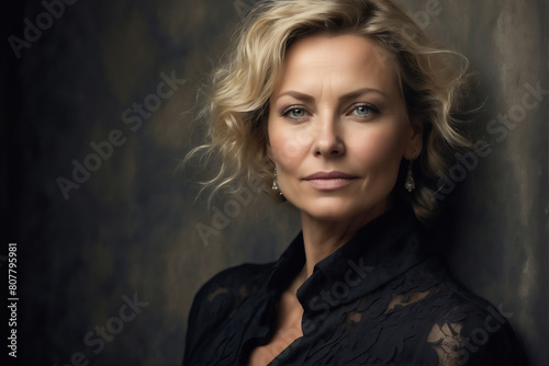 Fototapeta premium Sophisticated Swedish Woman in Early 40s with Elegant Black Lace Outfit in Studio Portrait
