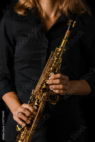 © Kostia, Obraz premium soprano saxophone in hands on a black background