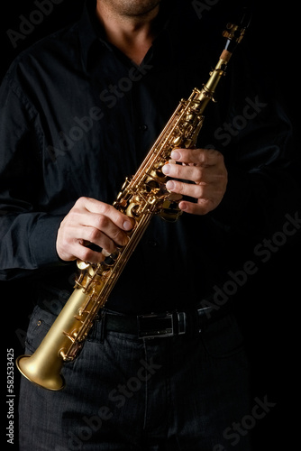 © Kostia, Obraz premium soprano saxophone in hands on a black background