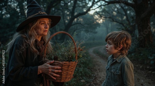 © Julia, Obraz premium Sorceress offering Jacob a basket of magic grass with a cunning smile, mystical exchange in enchanted garden, illustration for the fairy tale "Dwarf Nose"